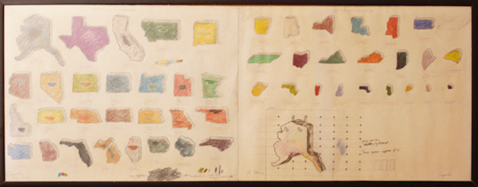 Toynton began drawing at the age of three, and continued throughout his life. Many of his drawings from the 70’s on were preliminary sketches for the large pegboard installations he’d been commissioned to create, and later for series of paintings he was thinking of making, but he also produced a number of figurative drawings late in life. These are just a few samples of his work over many years.
